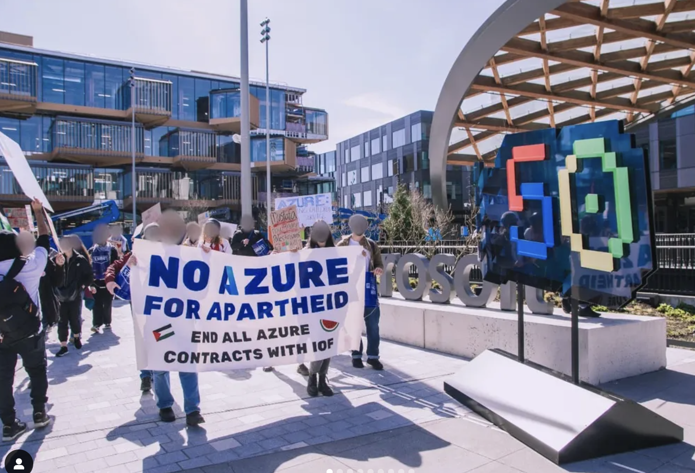 Above photo: Protest outside Microsoft 50th anniversary event. No Azure for Apartheid social media.