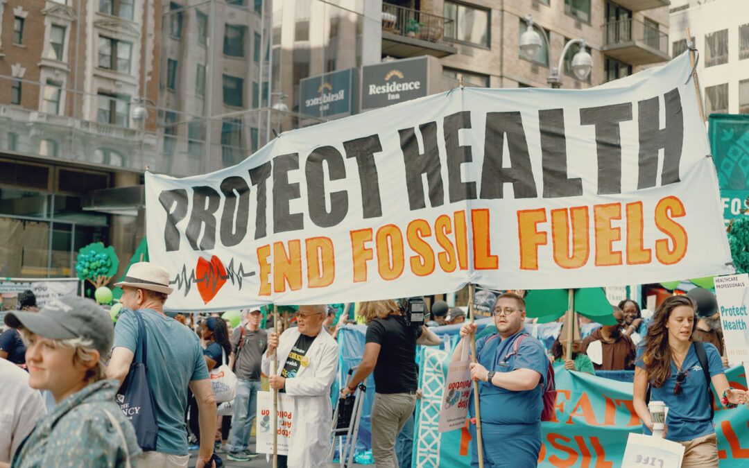 Above photo: Health workers marching to end fossil fuel use at New York Climate Week 2023. Skyler Knutzen/Global Climate and Health Alliance.