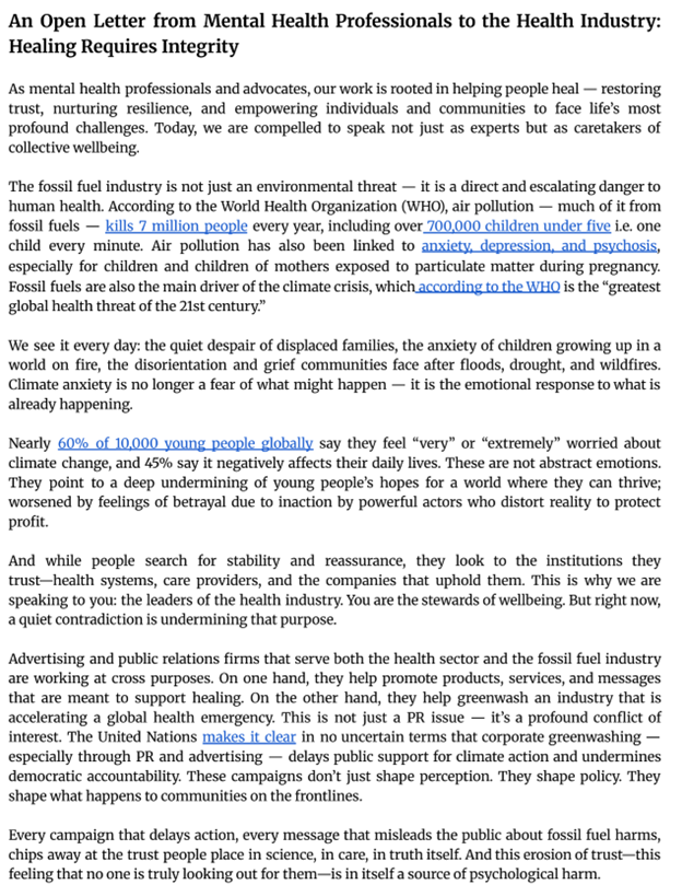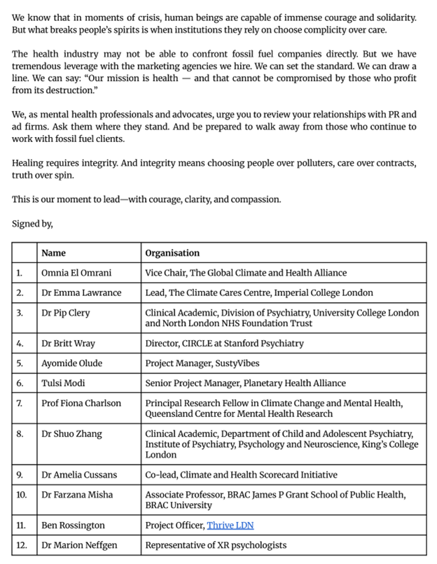 “We, as mental health professionals and advocates, urge you to review your relationships with PR and ad firms. Ask them where they stand. And be prepared to walk away from those who continue to work with fossil fuel clients,” the letter said.