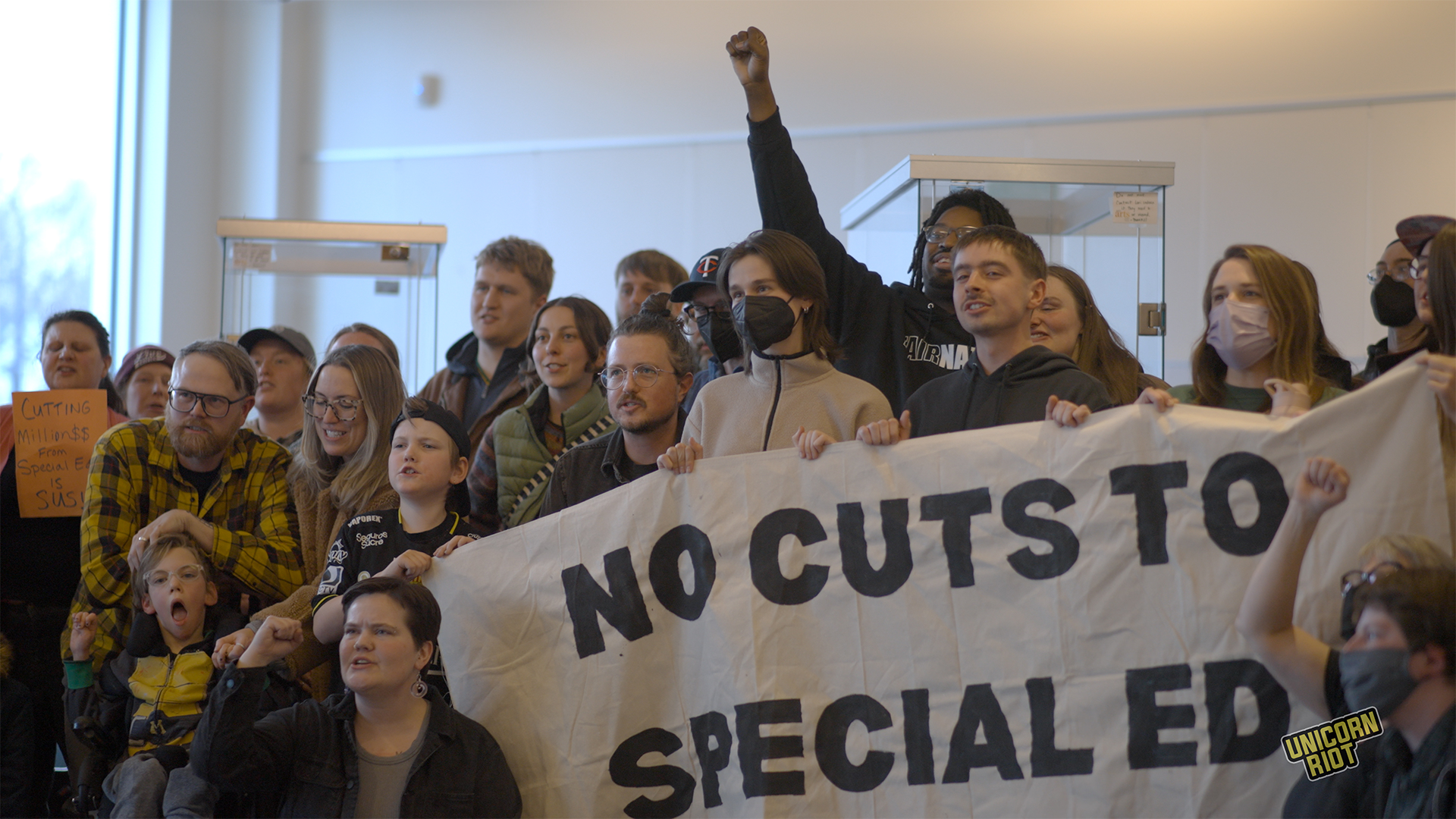 Minneapolis, MN — Dozens of teachers and parents interrupted a school board meeting to demand the Minneapolis Public Schools not cut special education department staff or funding. As special education teachers are beginning to be laid off and the Minneapolis Public School district faces a $75M budget deficit with plans for wide cuts, protesters are calling for the most vulnerable students in the district not to be on the chopping block.