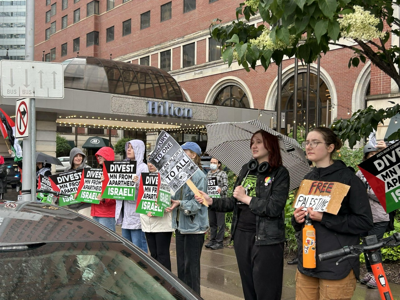 Minneapolis, MN – On June 13, over 100 protesters rallied outside the Democratic Farmer-Labor Party (DFL) annual Humphrey-Mondale fundraising dinner. Despite hours of rain, picketers chanted outside the Minneapolis Hilton hotel, demanding that DFL leaders use their power to divest Minnesota funds from apartheid Israel after almost two years of U.S.– funded genocide of Palestinians. The action was organized by the Minnesota Anti-War Committee (AWC).