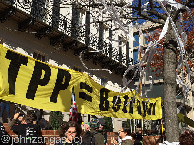 This week 63 organizations co-sponsored protests against the Trans-Pacific Partnership (TPP) in Washington, DC focusing on the US Trade Representative, White House, Chamber of Commerce, K Street lobbyists, embassies and Congress. Traffic was shut down, the US Trade Reps’ offices were blockaded and key members of Congress were confronted.