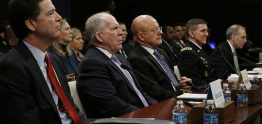 Above photo: Left to right, FBI Director James Comey, CIA Director John Brennan, Director of U.S. National Intelligence James Clapper, DIA director U.S. Army Lt. General Michael Flynn testify in Washington February 4, 2014.