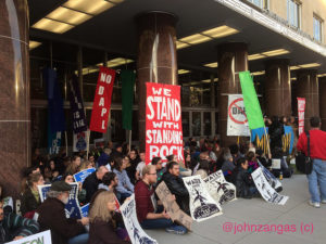 Security guards stood helplessly by on the other side of bolted doors, while well-known environmentalists, including actress Shailene Woodley, spoke out against the pipeline, which, if completed, would send 460,000 gallons of Bakken crude to Chicago for refining. She called on the public to pay attention to the brutal police response to the Standing Rock Sioux. The sit-in was but one action in over 300 actions in cities across the nation.