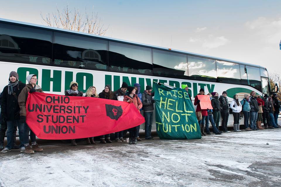 The weather was below freezing, but we managed to keep warm. Arms locked, feet grounded, toes cold, we surrounded a bus awaiting OU’s Board of Trustees (BoT) who were on their way to finalize decisions regarding tuition hikes and raises for wealthy administrators. We also protested a natural gas plant they plan to build with university money.