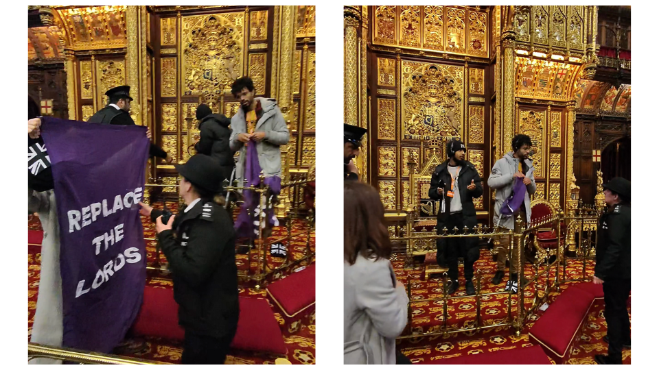 Touring the house of lords chamber at 9:30am on 19 December, they climbed a barrier to take their place around the king’s throne. They unfurled a banner that read: ‘REPLACE THE LORDS’. Almost immediately they were intercepted by Metropolitan Police officers stationed in the room, and parliamentary security guards. They were removed, detained, and questioned on site before being released without arrest.