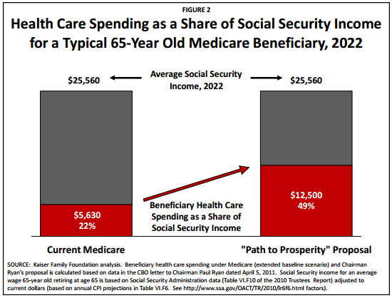 [A] typical retiring 65-year old in 2022, with average earnings, would have out-of-pocket expenses for their health care that consumed nearly half of their Social Security income that year under Chairman Ryan’s proposal, double the amount they would pay under traditional Medicare. Beneficiaries who receive lower Social Security checks (e.g., people who retire and start receiving Social Security benefits before the age of 65) would devote a larger share of their Social Security income towards their health care expenses.