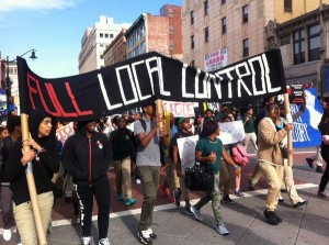 The Newark Student Union walked out of their classes for two days. On the first day they rallied at a park where they held classes on the history of student protests, a ‘know your rights’ training and artistic activism; and shared their lunch with the homeless. The second day, they went to the office of the Newark Public Schools and blockaded an intersection. They locked arms, some in PVC tubes, and snarled traffic in downtown Newark. Their demands were for local control of schools and stopping the privatization and corporatization of Newark schools. After holding a blockade for nearly 12 hours, the students released their arms and formed a group hug chanting “I believe that we will win! I believe that we will win!” (Check out this link for lots of great photos by citizen journalists on the scene.)