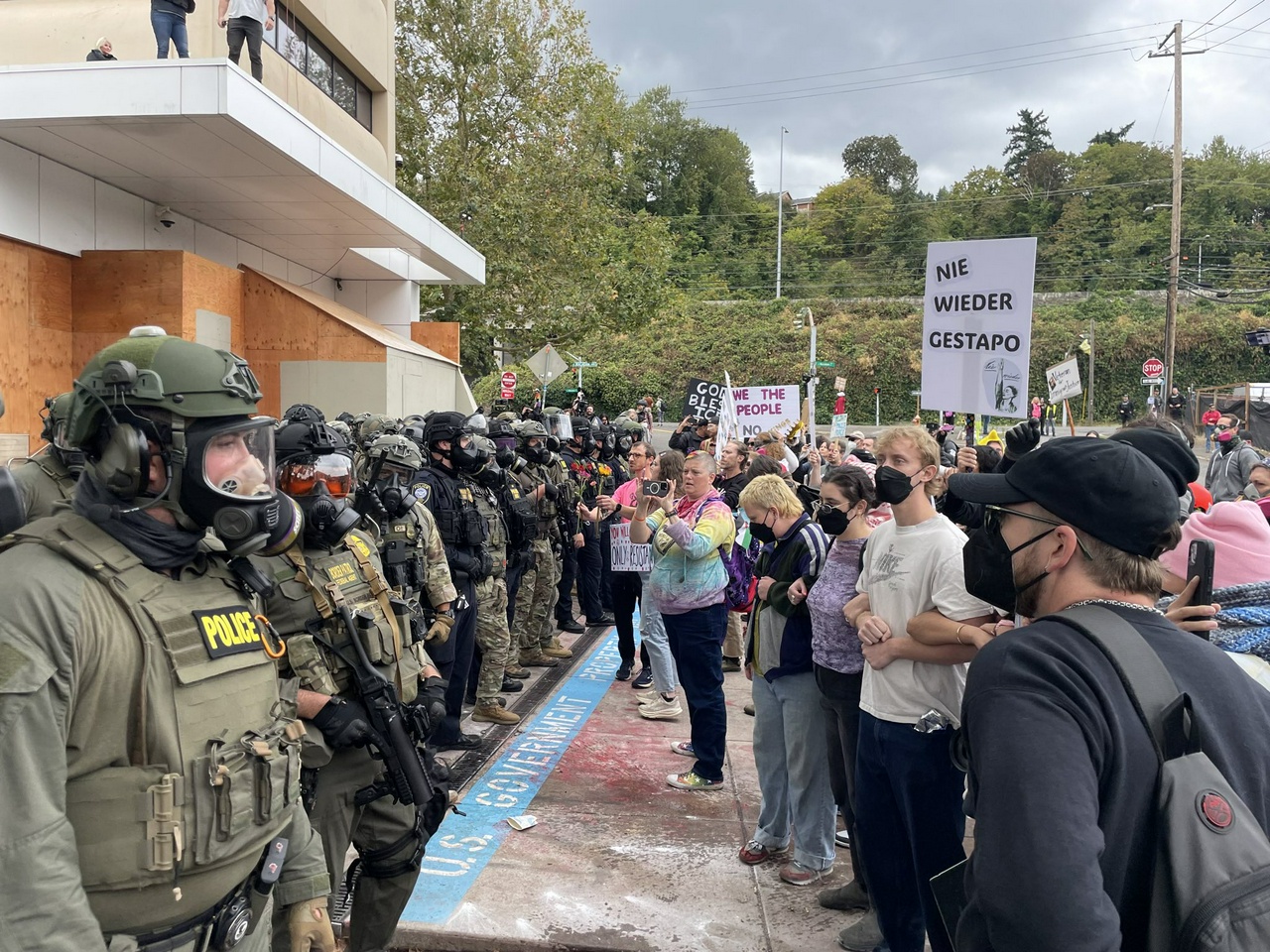 October 4 marked a change in demeanor. Within 20 minutes of the crowd arriving, DHS came through the facility’s front gate and intentionally targeted and assaulted event organizers, arresting five and imprisoning them in the facility. One was a member of P4P, Lora Wilde. The other four were members of PDXCD: Holly Brown, Cass Cano, Elijah Thahir and Leticia Navarro.
