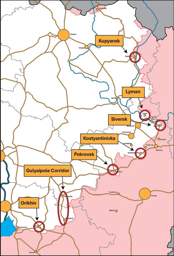 Kupyansk is largely under Russian control. During the last days Russian forces took some 25% of Siversk. Pokrovsk is to 95% in Russian hands. Fighting in its encircled sister city Mirnograd is slowly coming to an end. The road between Pokrovske and Guliaipole has been taken. The later city is thus cut off from its main supply line and will soon be encircled.