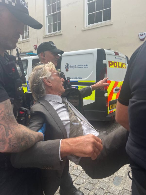 Ahead of what is expected to be a major groundswell in numbers on 9 August, members of the public offered sustained applause to those arrested in Truro, whose number included 81 year-old Deborah Hinton, a former magistrate: