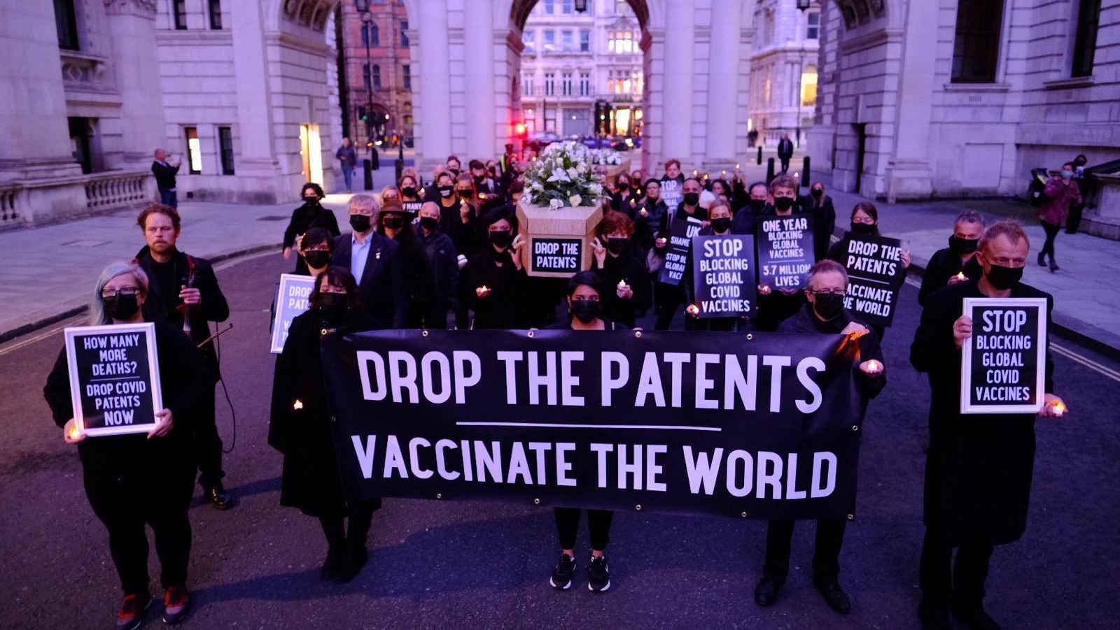 Above photo: A protest against the UK government’s refusal to back the TRIPS waiver proposal held in London on October 12. Jess Hurd/ Global Justice Now.