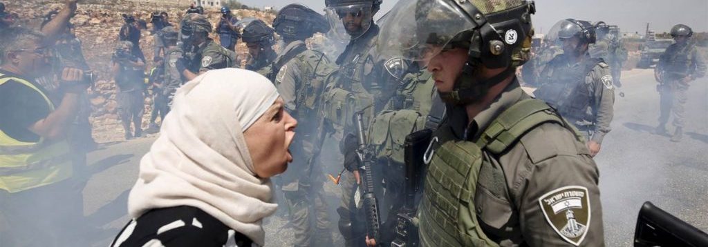 Above Photo: A Palestinian woman argues with an Israeli border police officer during a protest against Jewish settlements in the West Bank village of Nabi Saleh on Sept. 4, 2015. Credit: Mohamad Torokman / Reuters