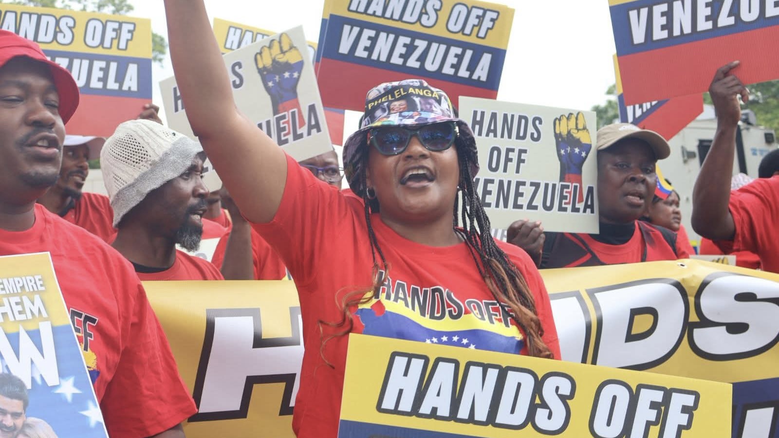 Waving the Venezuelan colors alongside the red hammer-and-sickle flags, hundreds marched to the US embassy in Pretoria, protesting US aggression on Venezuela.