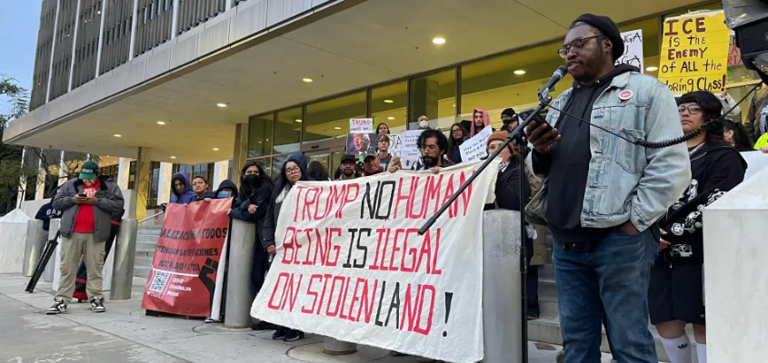 Above photo: Carlos Sirah of Black Alliance for Peace SoCal speaks as community groups in Los Angeles unite against ICE. Abraham Marquez for L.A. TACO.