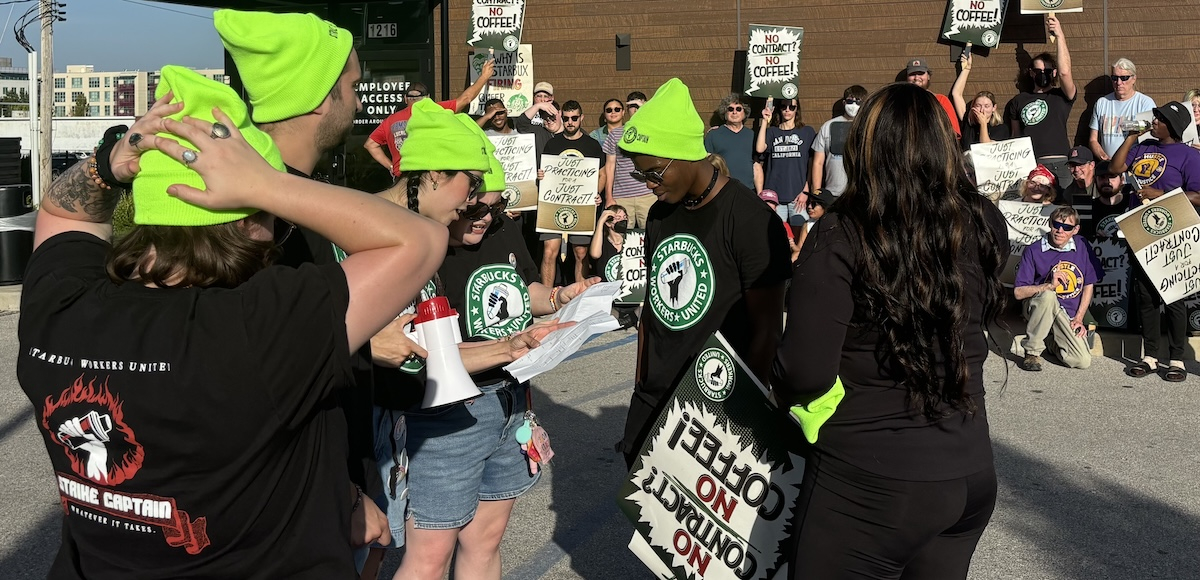 Above photo: Starbucks strike captains gathered to plan a practice picket in St. Louis, Missouri, on October 2. Eighty more stores plan pickets starting October 25, limbering up for a possible strike. SBWU.