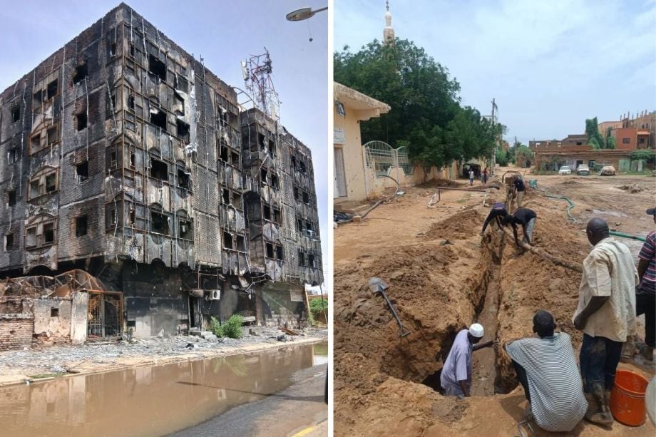 Above photo: On the left, a tower building that contained medical clinics, grocery stores, residential apartments and offices was completely burned down by rocket fire in southern Khartoum. On the right, civilians work to reconnect water lines in the neighborhood of Buri Al-Mahss. Aunnab Elma and Ahmed Kamal.