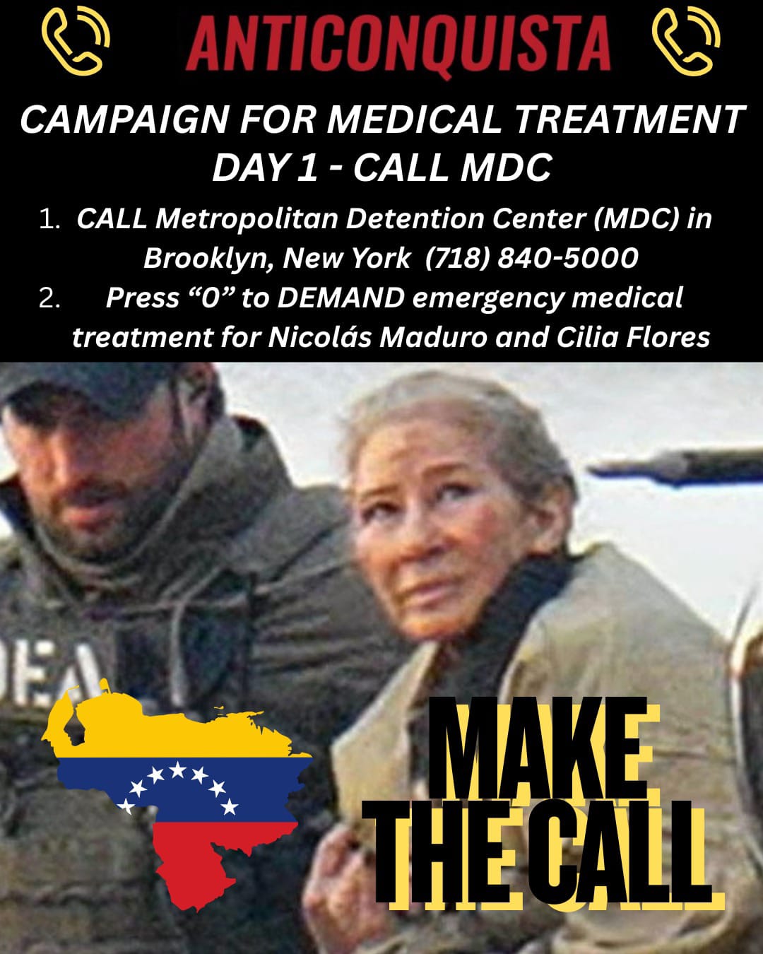 1. Call the Metropolitan Detention Center to demand medical care for President Maduro and First Lady Flores, who were injured during their abduction by the US military.