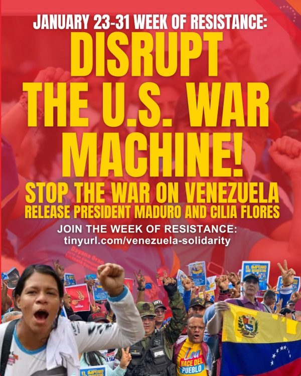 The rally will also be a platform to strengthen our collective mobilization for a coordinated week of resistance January 24-January 31 to target strategic political pressure points to stop the war on Venezuela in solidarity with the people’s resistance in Venezuela, Latin America and the Caribbean.