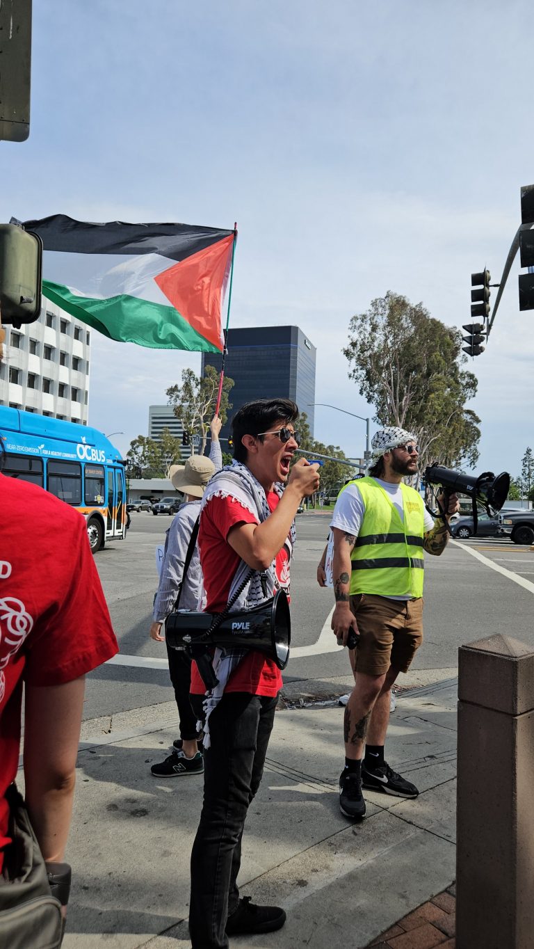 Costa Mesa, CA – On Saturday, May 31, chants of “Free, free Palestine!” were heard as about 50 protesters gathered on the corner of Sunflower and Bristol in Costa Mesa. The protest was across from South Coast Plaza, which is a luxury shopping center filled with high-end stores that rakes in $2 billion per year. Emcee Amy Parker of the Orange County Democratic Socialists of America (OC DSA) reminded the crowd that the plaza is owned by the Zionist Sergerstrom family. The family has also donated at least $40 million to the Sergerstrom Center of the Arts which was also protested earlier this year for hosting the Israel Philharmonic.