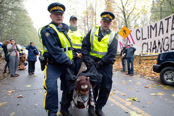 The group deployed multiple banners demanding funders divest from Spectra Energy due to the impacts of the company’s projects to local communities and the climate, with one of them hanging from a 24 foot tripod and refusing to leave.