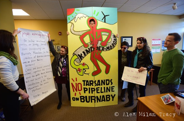 One person climbed and hung off of a 24 foot tall tripod and others blocked office entrances while a band played music and balloon banners were released. Two arrests were made. The action was part of the week of "Respect and Resistance" to stop Spectra's proposed expansion of a major fracked-gas pipeline through the Northeast. The New England group Fighting Against Natural Gas has conducted two rousing actions in the last two days against greenwashing, fracking, and energy infrastructure. On Wednesday morning a group of New Englanders were arrested for occupying and shutting down the offices of Spectra Energy to protest the company’s plans to expand a network of fracked gas pipelines in the region.