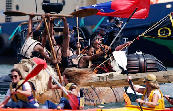 The 30 warriors joined a flotilla of hundreds of Australians in kayaks and on surfboards to delay eight of the 12 shipsscheduled to pass through the port during the nine-hour blockade, which was organised with support from the U.S.-based environmental group 350.org.