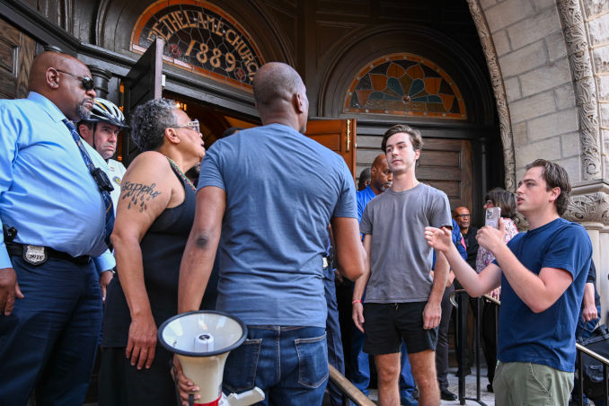 Philadelphia - At a meeting Sept. 18 called by Philadelphia District Attorney Larry Krasner to oppose the use of federal troops in Philadelphia or other cities, community members stood on an historic church’s steps and kept about five fascists from entering. Krasner is running for a third term as District Attorney. Part of his re-election campaign is persistent criticism of President Donald Trump’s policies. At the first of three meetings Krasner called earlier to oppose the use of federal troops in Philadelphia or other cities, a Trump supporter named Frank Scales alongside a few others disrupted Krasner’s remarks with racist, right-wing denunciations. Coming off as a Charlie Kirk wannabe, Scales announced a protest against Krasner’s 3rd planned meeting, the one scheduled Sep. 18.