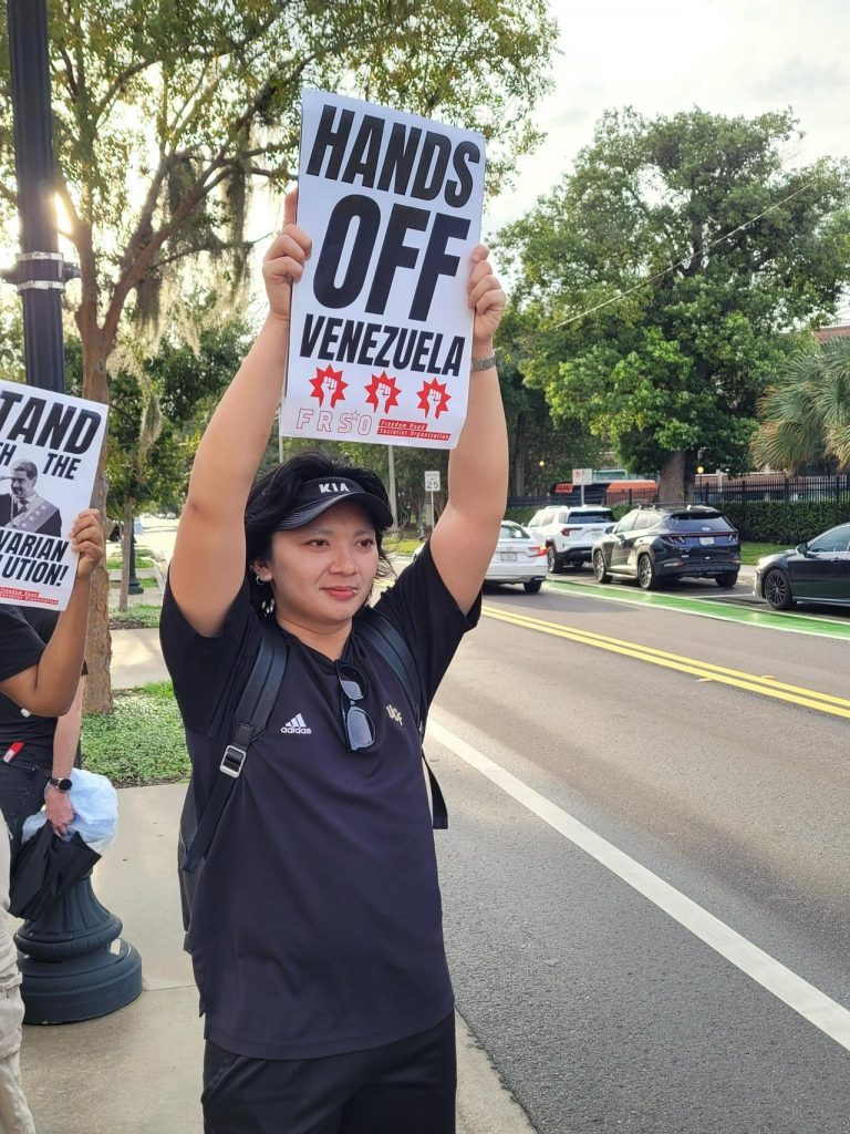 Orlando, FL – On Friday, September 13, 20 activists held an emergency rally outside the Federal Courthouse in downtown Orlando to denounce the recent U.S. military attacks, and any future aggression, against Venezuela. The rally was organized by FRSO Orlando and co-sponsored by Orlando DSA, University of Central Florida Students for a Democratic Society, Orlando for Peace, and several other organizations. The event was in response to Donald Trump’s dangerous military escalations against Venezuela, including the deployment of U.S. warships into the Caribbean and a recent military strike against a Venezuelan boat that killed all eleven Venezuelan civilians on board. Trump’s government has also put a $50 million reward for the capture of the democratically-elected president of Venezuela, Nicolas Maduro.