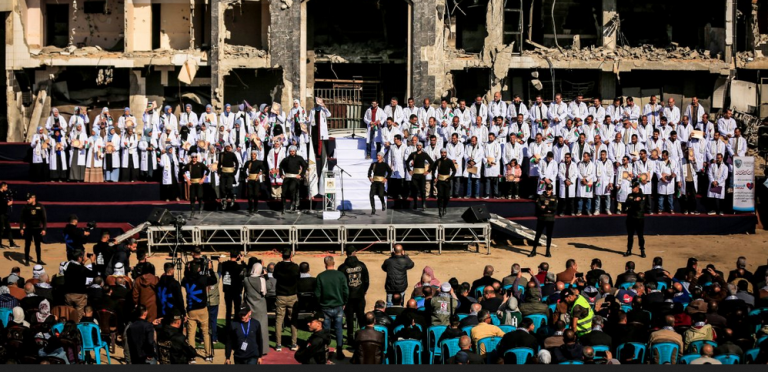 On Thursday, December 25th, 2025, during Israel’s ongoing genocide against Palestinians, 168 students graduated from medical school, in Gaza. Wearing their white coats, they stood in front of the ruined façade of what was formerly Gaza’s largest hospital, the Al-Shifa Medical Complex. As a backdrop, the destroyed building realistically conveys perils the graduates faced while earning their medical degrees. Throughout the last two years of their studies, they risked assassination, injury, arrest, imprisonment, and torture, as well as attacks on their own family members.