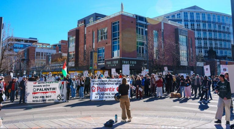 Denver, CO – On January 31 over 100 protesters gathered at James Manley Park in Denver for a rally against the tech and AI surveillance company Palantir, which has been headquartered in the state since leaving their Silicon Valley location in 2020. This spring, the company plans to move from their downtown Denver office to the Cherry Creek Financial House just four miles away.