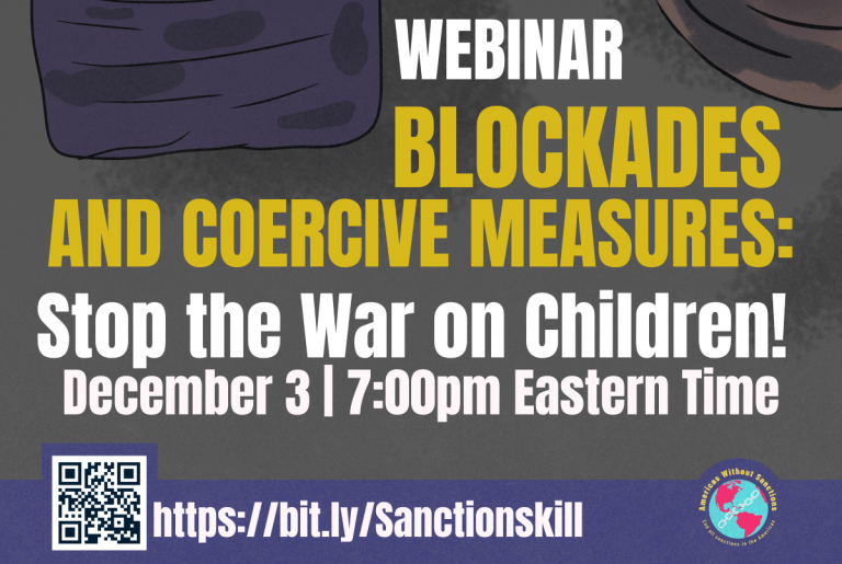 On the eve of the International Day against Unilateral Coercive Measures, Americas Without Sanctions/SanctionsKill will host a webinar on BLOCKADES AND COERCIVE MEASURES: STOP THE WAR ON CHILDREN! Co-moderated by Dr. Margaret Flowers, pediatrician, director of Popular Resistance and co-founder of SanctionsKill; and Dr. Adlah Sukkar, a pulmonologist, lifelong human rights defender, and founding member of Doctors Against Genocide. The webinar is part of a new campaign launched this month in which health workers are invited to sign a letter to the US government demanding an end to its use of unilateral coercive measures (sanctions).
