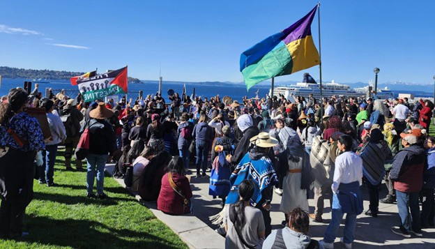 Seattle, WA – Hundreds marched for Indigenous People’s Day on October 13, this year marking the city of Seattle’s first recognition of the holiday. Starting at the city’s Henry M. Jackson Federal Building where immigration hearings are held, drummers of all ages led marchers through the streets of downtown Seattle, ending at Pike Place’s Indian Park.