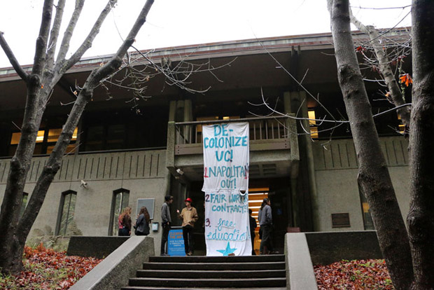 (AP) Students set fires and made barricades during the first day of a student strike to protest a government education reform and cutbacks in grants and staffing, at Complutense University, in Madrid, Spain, Wednesday, March 26, 2014. Spanish police say they have arrested more than 50 students when the police moved in to end the occupation of a campus building after the university had asked them to intervene. Students, many with their faces covered, set fire to trash containers and set up barricades on at least two streets in the university complex during the protest.