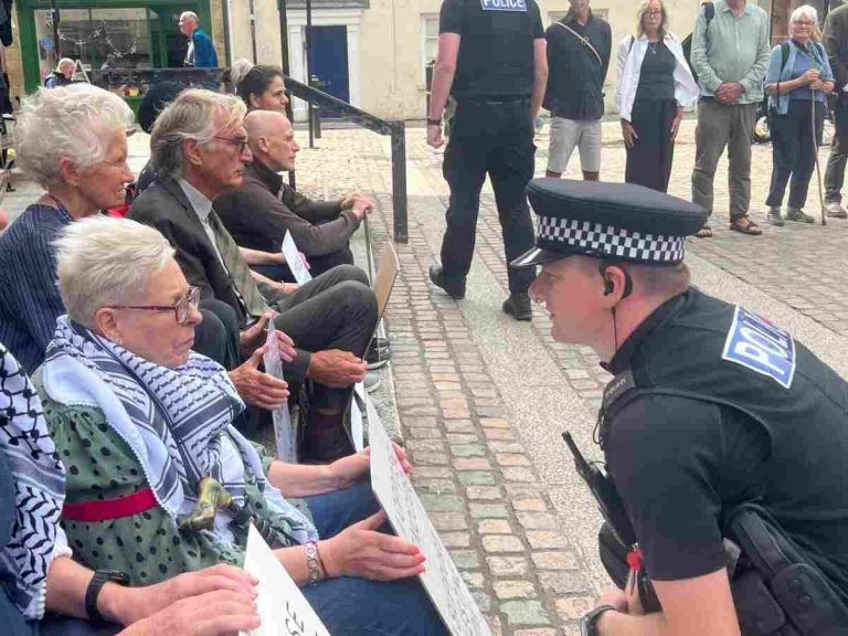 On Saturday 5 July, the day Palestine Action was proscribed as a terrorist organisation, 29 people were arrested for sitting in Parliament Square with handwritten signs that read “I oppose genocide. I support Palestine Action.” Among them was an 83-year-old priest, Sue Parfitt, who described the significance of the action – it was “testing out the law”, she told our reporter.