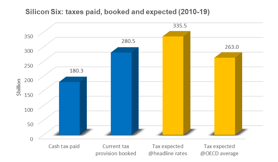 The report finds that there is a significant difference between the cash taxes paid and both the expected headline rate of tax and, more significantly, the reported current tax provisions. It concludes that the corporation tax paid by the Silicon Six is much lower than is commonly understood. Over the period 2010 to 2019: