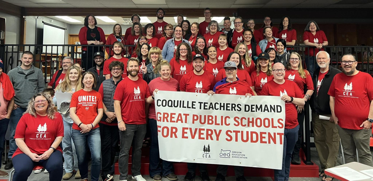 Above photo: Coquille, Oregon, educators saw through their school district’s divide-and-conquer strategy. Coquille Education Association.