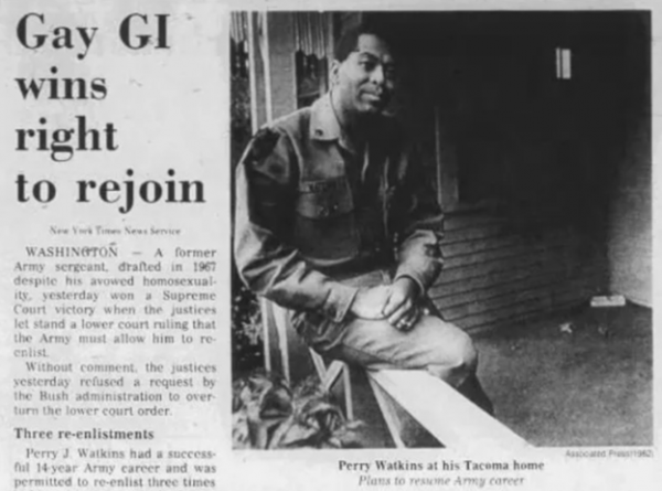 Around the same time, African American soldier SSG Perry Watkins was waging a fight to stay in the military while openly gay. Ultimately discharged for being gay in 1981. But Watkins continued fighting in the courts, and in 1990 actually won a reversal, awarding them an Honorable Discharge.