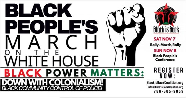 Take Action: Black People’s March on the White House. Saturday, November 7, 2020. Starts with a rally from 11:30 am to 2:00 pm at Malcolm X Park near 16th and W Streets, NW.