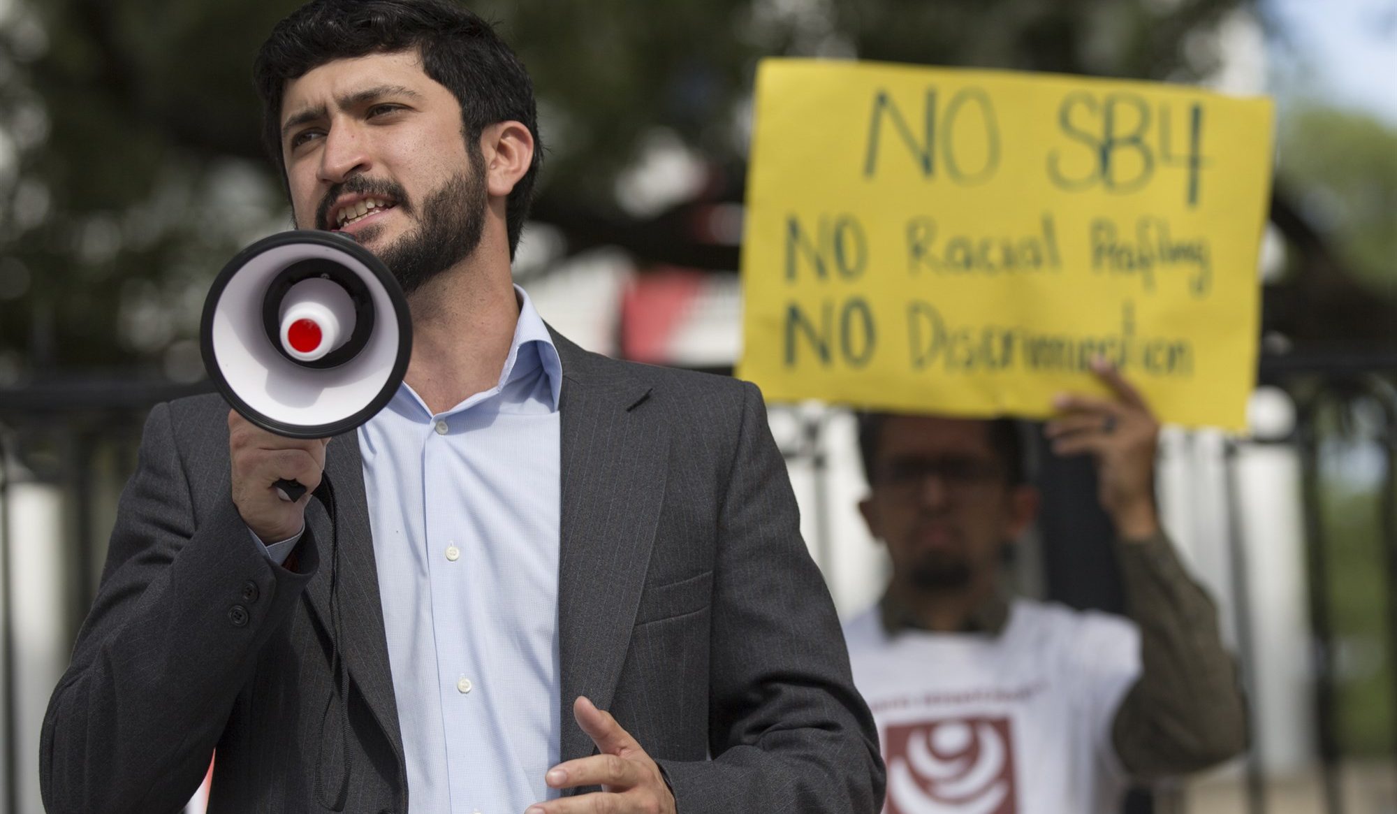 Above Photo: “Freedom City” supporter Gregorio Casar, an Austin City Council member, at a protest outside the Texas governor’s mansion in Austin on May 8, 2017.Ricardo B. Brazziell / Austin American-Statesman via AP file