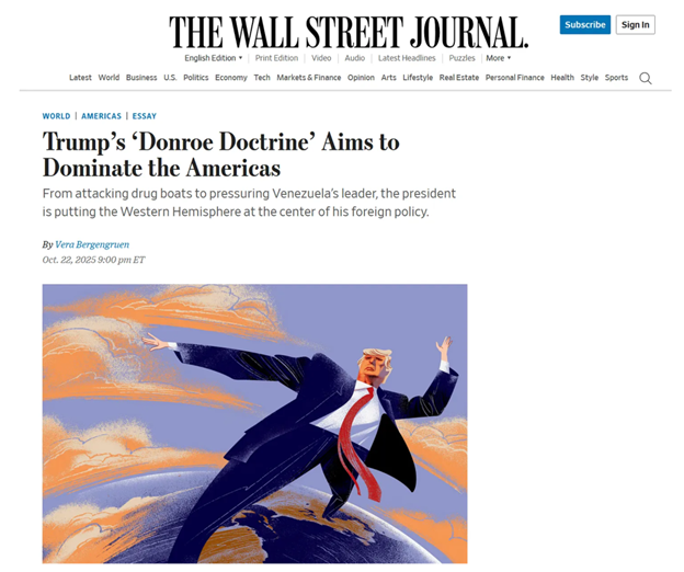 According to this neocolonial Donroe Doctrine, the Wall Street Journal wrote, Trump is “treating the hemisphere as an extension of the U.S. homeland, where Washington will act unilaterally to root out perceived enemies. Loyalty is rewarded, and defiance can carry a price”.