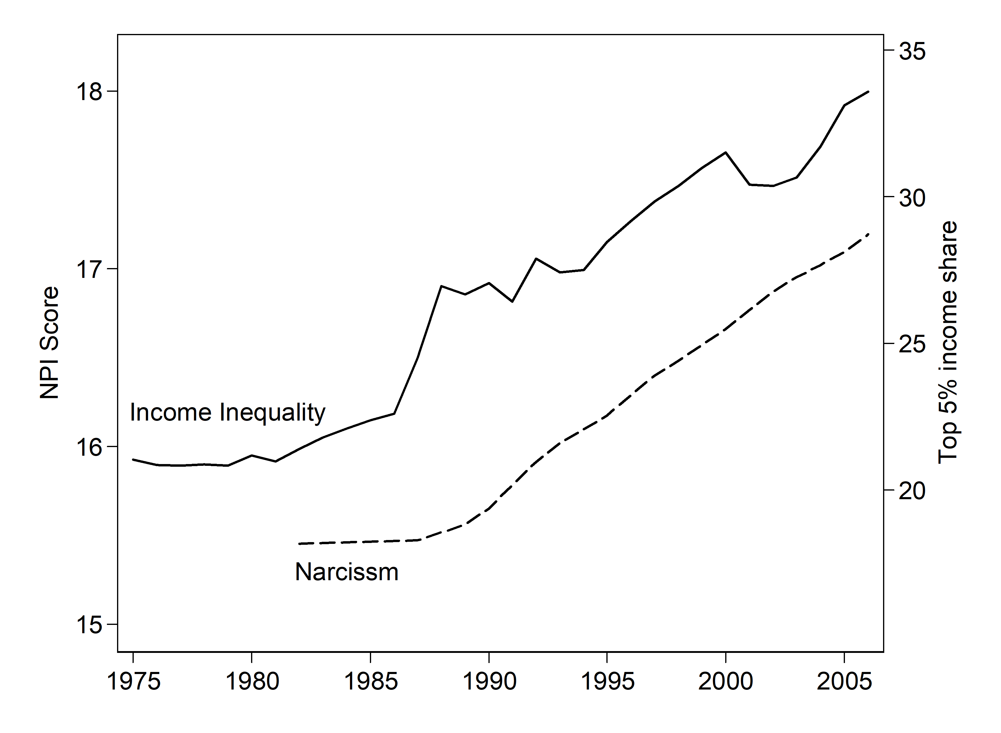 A second is to try to flaunt your own worth and achievements, to ‘self enhance’ and become narcissistic. Psychotic symptoms such as delusions of grandeur are more common in more unequal countries, as is schizophrenia. As the graph below shows, narcissism increases as income inequality rises, as measured by ‘Narcissistic Personality Inventory’ (NPI) scores from successive samples of the US population.