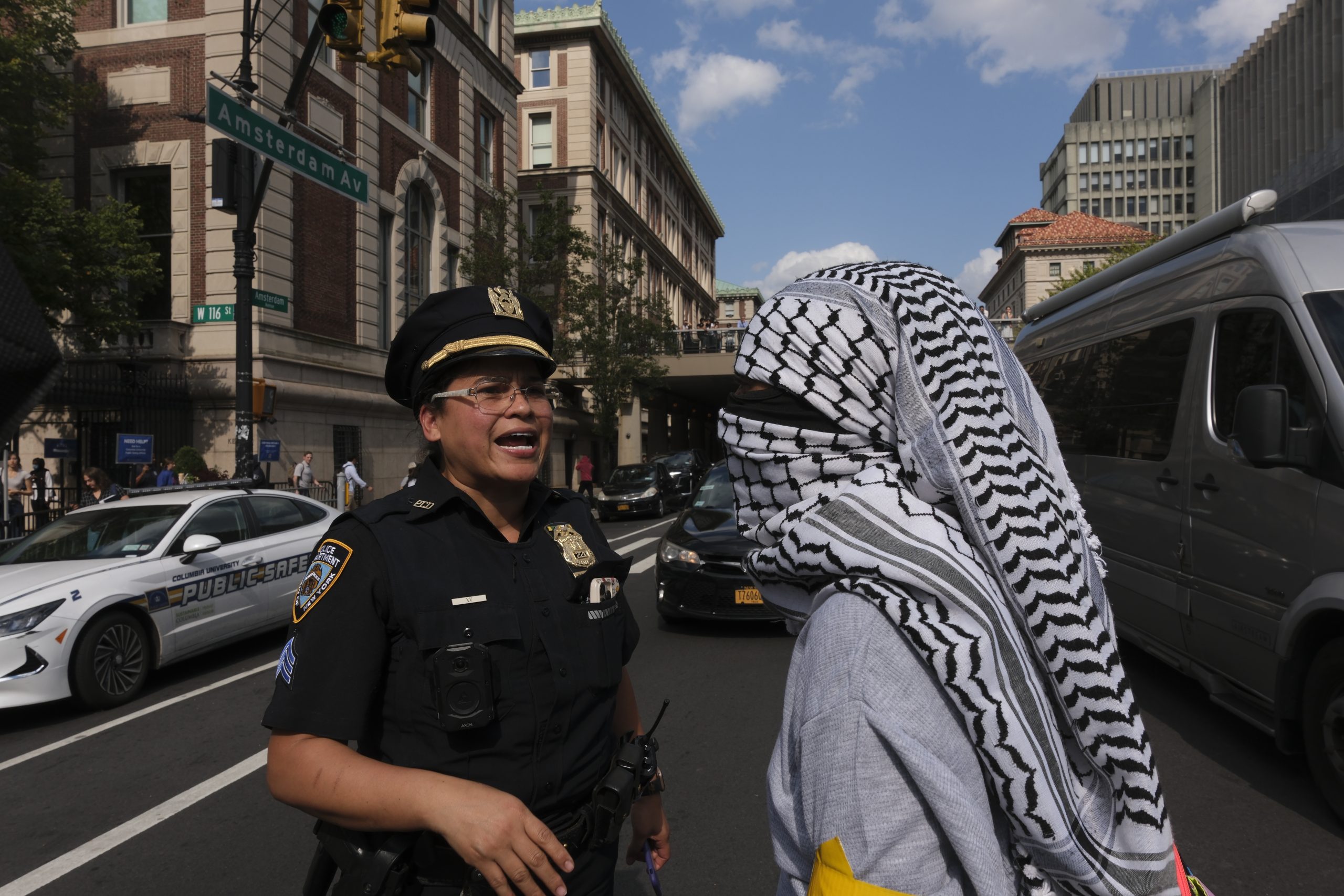 Above photo: A student is confronted by a New York Police Department officer outside Columbia University on October 7, 2024. Tamara Turki.