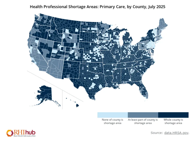 Map showing county-level data on Primary Care Health Professional Shortage Areas (HPSAs), indicating counties that are entirely in a HPSA, partially in a HPSA, or not in a HPSA. (Health Resources & Services Administration)