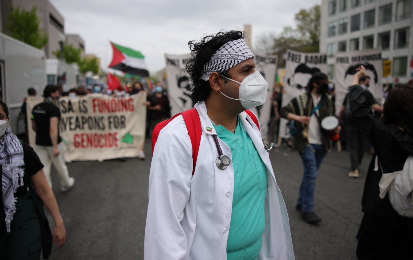 Above photo: A person dressed in medical scrubs participates in a Pro-Palestine march to the US Immigration and Customs Enforcement headquarters in Washington, DC, on April 5, 2025. Bryan Dozier / Middle East Images / Middle East Images via AFP via Getty Images.
