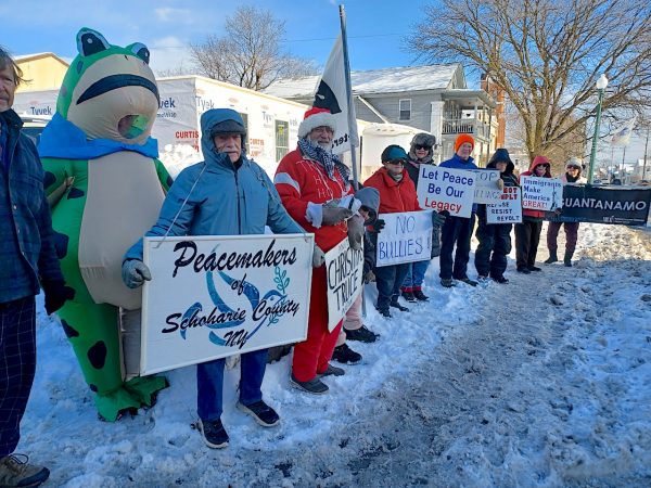 The Peacemakers of Schoharie County at their vigil in Cobleskill, NY, which took place on Saturday December 6, 2025, featuring their activist frog, and also Santa Claus. Sue Spivack wrote, “13 Peacemakers of Schoharie County showed up to call for GITMO closure and a hard STOP to any further illegal transfers by ICE of migrants and asylum seekers to the infamous prison. Thanks for faithfully coordinating this.”