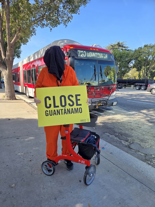 Campaigner Julie Alley at the vigil in Los Angeles on December 3, 2025. Jon Krampner wrote, “Julie and I did our vigil on Wednesday in front of the Westwood Federal Building. We got some honks of solidarity and a few people yelled insults at us, one of them using the ‘f’ word. As usual, there was very little pedestrian traffic, but a man walking along asked me how many prisoners are still at Guantánamo. Being an Andy Worthington adept, I said 15. Right, he said, you pass the test. It was astonishing to find a random pedestrian who knew that.”
