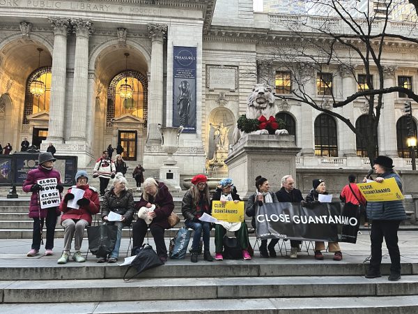 Campaigners at the vigil on the steps on the New York Public Library in Manhattan on December 3, 2025. Activist and photographer Linda Novenski wrote, “Our numbers grew over the first 20 minutes, and then Debra Sweet [the national director of the World Can’t Wait, on the right of the photo] took the mike and powerfully spoke of Guantánamo and its unconvicted prisoners still there after 24 years! Then we were led in song by Paul Stein and his trusty accordion. Thank you, Debra, for speaking so passionately against fascism, torture prisons, and kidnapping of immigrants … and more.”