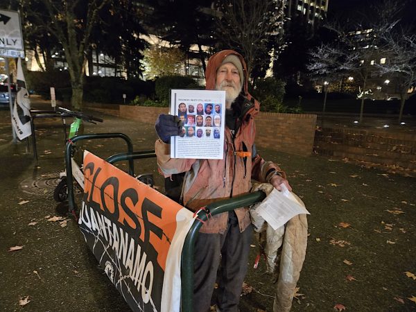 Campaigner Jack Herbert from the Portland Central American Solidarity Committee (PCASC) joined Dan Shea of Veterans for Peace for the vigil in Terry Schrunk Plaza in Portland, OR on December 3, 2025. He’s holding a print-out of the Close Guantánamo page showing the 15 men still held.