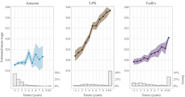 At Amazon, wages start at $17 an hour and don’t increase with tenure. Nearly half of workers have less than a year on the job.